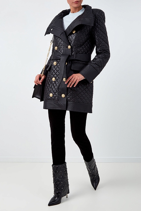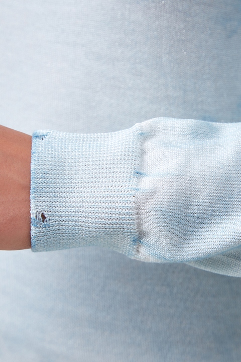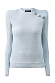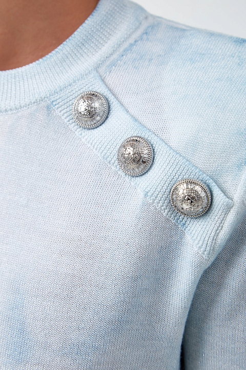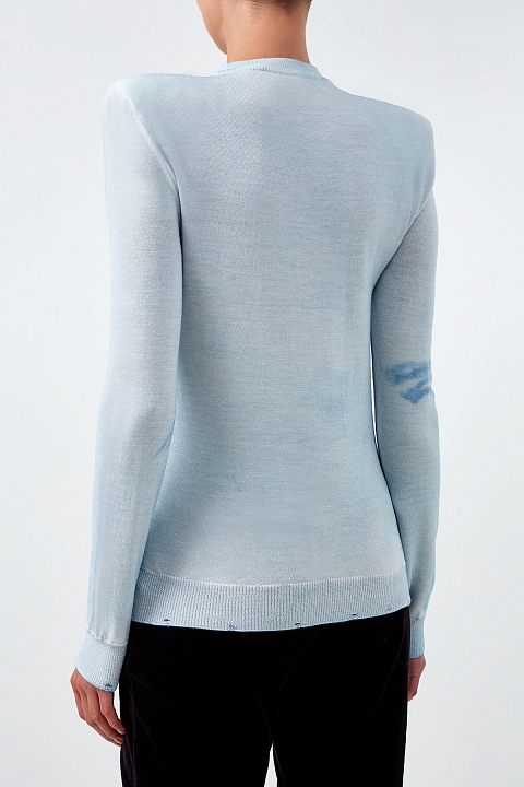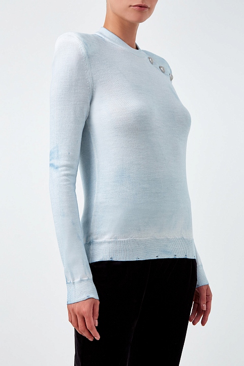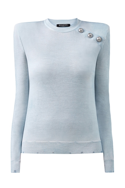 Оригинальный джемпер из чистой шерсти от Balmain. Модель тонкой вязки выполнена в голубом оттенке с вплетенной нитью серебристого люрекса, которая придает поверхности деликатное мерцание. Декоративные отверстия и неравномерный эффект окрашивания достигаются мастерами бренда вручную — так каждое изделие становится действительно уникальным. Фирменный стиль подчеркивают объемные подплечники и декор заклепками на плечевом шве.