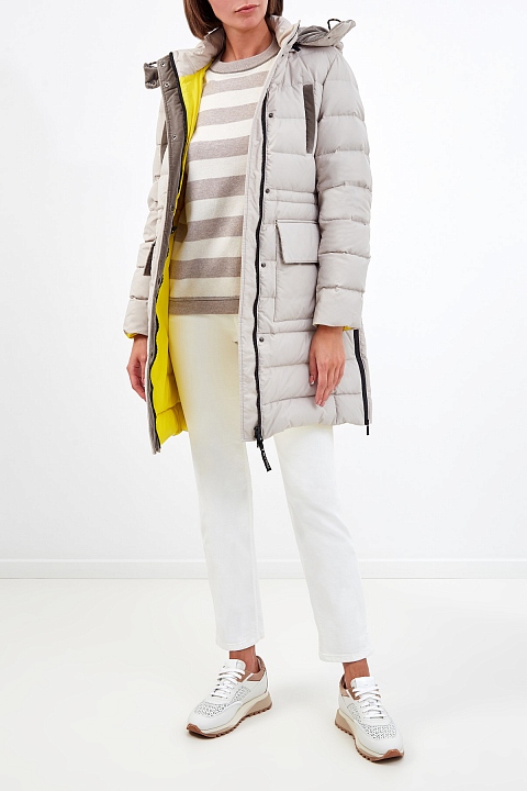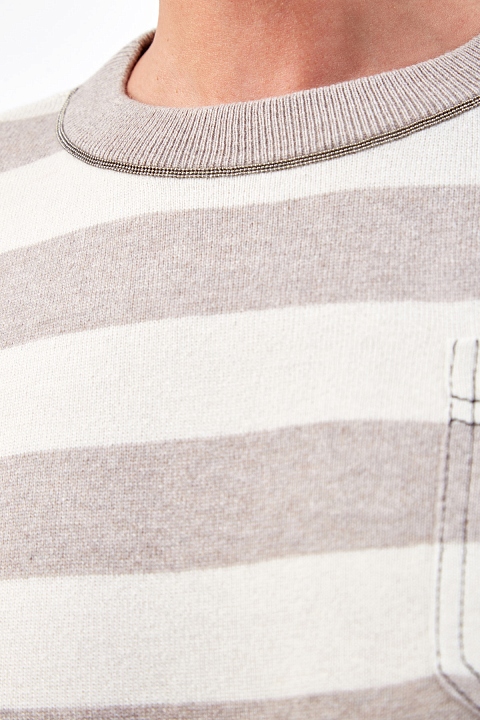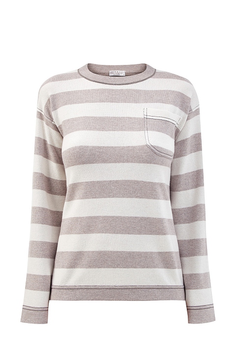 Лаконичный джемпер от Brunello Cucinelli выполнен из тонкой пряжи в белых и бежевых тонах. Полностью натуральный состав на основе волокон шерсти, кашемира и шелка обеспечивает максимальный комфорт. Расслабленный стиль изделия подчеркнут интарсийным узором в полоску и вышивкой Мониль на кромках. Свободный силуэт не стесняет движений и подходит для создания многослойных образов. Детали: спущенная линия плеч, накладной карман на передней планке, круглый вырез горловины. Сделано в Италии.