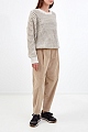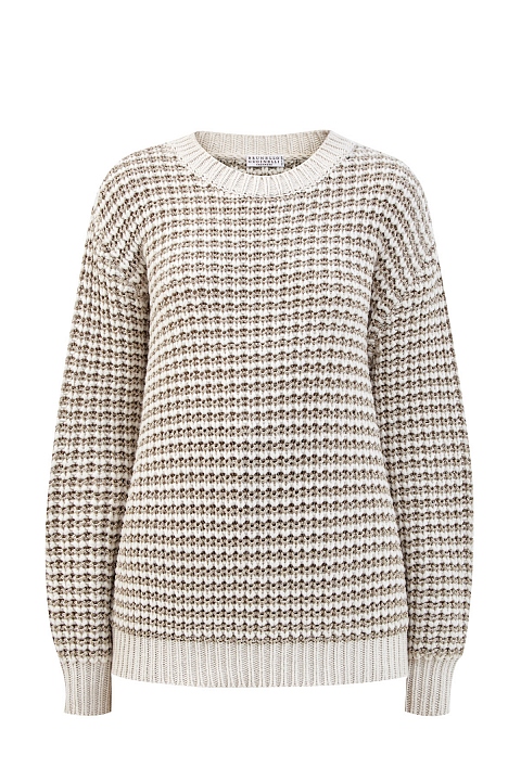 Джемпер объемного кроя от Brunello Cucinelli сочетает воздушную пряжу из кашемира и шерсти с мерцающими золотистыми вставками нити ламе. Изысканные материалы и расслабленный силуэт со спущенной линией плеч придают образу настроение в стиле sprezzatura. Детали: круглый вырез, эластичная однотонная обвязка манжет и нижнего края. Сделано в Италии.