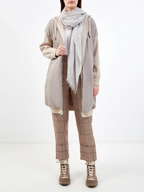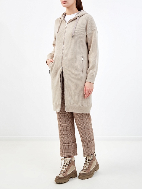 Элегантный кардиган удлиненного кроя от Brunello Cucinelli. Одна сторона изделия выполнена из ценного кашемира английской вязки, другая — из матового нейлона. Модель свободного кроя с мягкой линией плеч дополнена прорезными и накладными карманами. Капюшон на кулиске завершает минималистичный дизайн. Сделано в Италии.