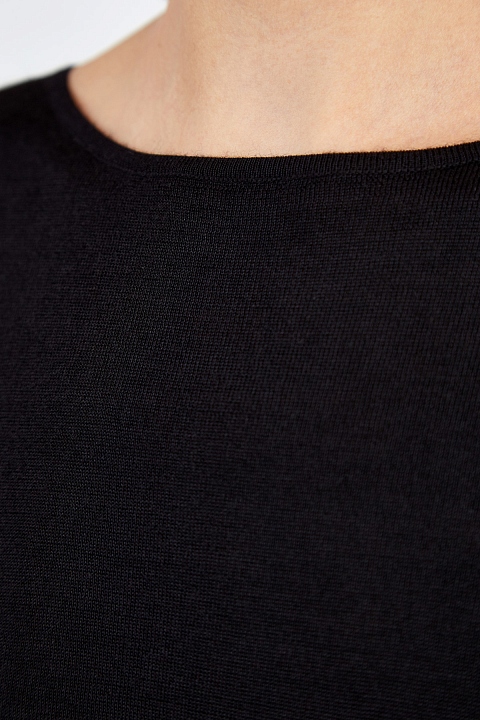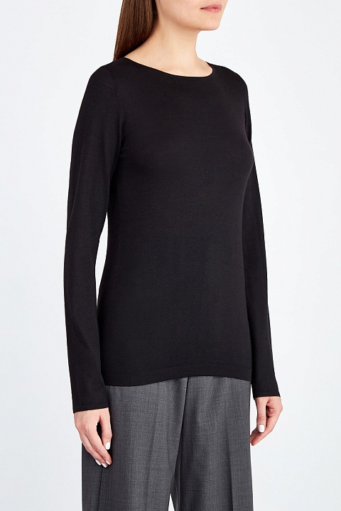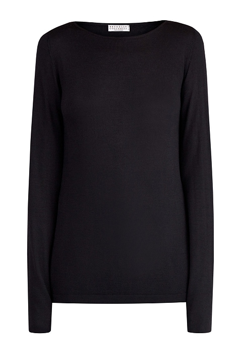 Легкий лонгслив от Brunello Cucinelli из кашемира и шелка Sparkling в угольно-черном цвете. Длинный рукав и пройма горловины «лодочка» подчеркивают лаконичный дизайн в духе минимализма. Кромки и манжеты закрыты объемным швом двойной иглой. Сделано в Италии.