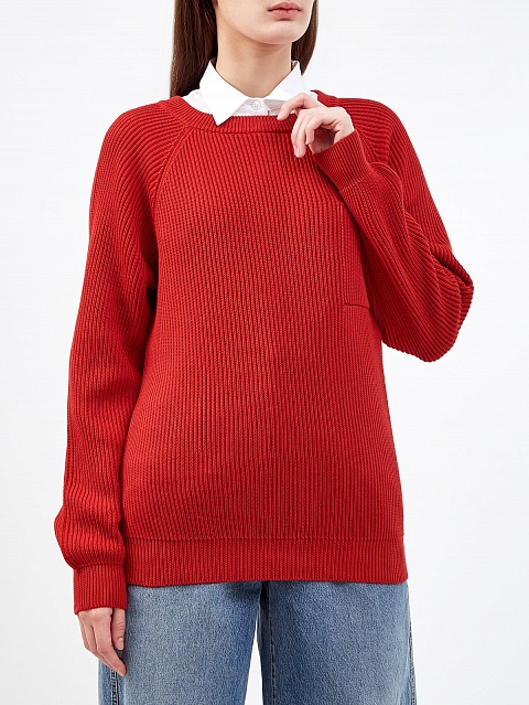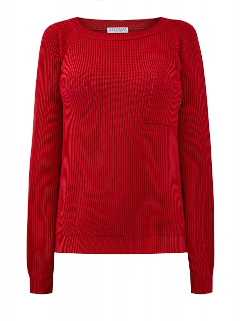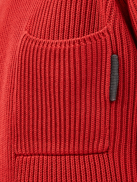Стильный джемпер от Brunello Cucinelli выполнен из мягкой хлопковой пряжи. Фактурный узор и насыщенный алый оттенок подчеркивают расслабленный стиль изделия, эластичная отделка кромок обеспечивает комфортную посадку. Особенностью модели стала выполненная вручную отделка из мерцающей цепочки Мониль на переднем кармане. Сделано в Италии.