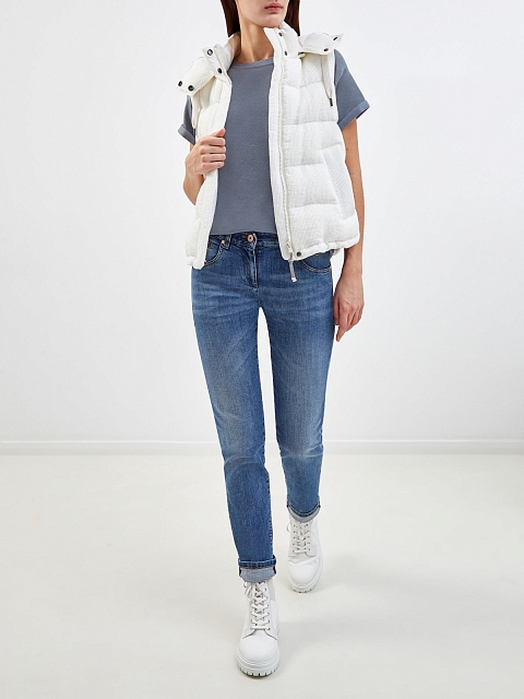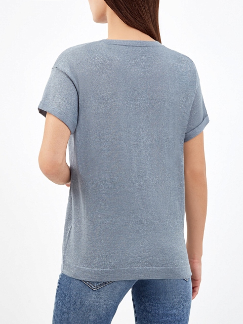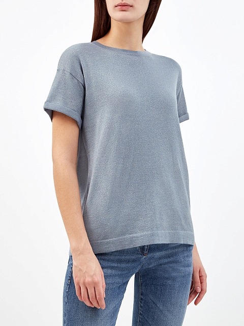 Элегантный джемпер с короткими рукавами от Brunello Cucinelli создан из мягкой кашемировой пряжи с добавлением шелка и металлизированной нити ламе. Синтетическое волокно в составе обеспечивает комфорт в движении и облегчает уход за изделием, свободный крой и приглушенный голубой оттенок подчеркивают присущее бренду расслабленное настроение. Сделано в Италии.