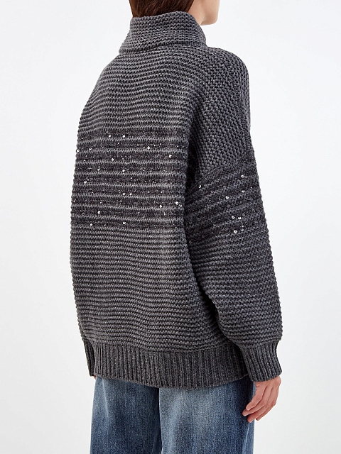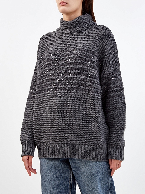 Стильный джемпер в приглушенной серой гамме от Brunello Cucinelli. Модель создана из теплой шерстяной пряжи с добавлением кашемира для дополнительной мягкости, шелк Diamante вносит изысканный контраст фактур. Расслабленный и женственный стиль изделия подчеркнут вплетенными вручную пайетками. Свободный крой не стесняет движений, эластичные кромки обеспечивают комфортную посадку. Сделано в Италии.