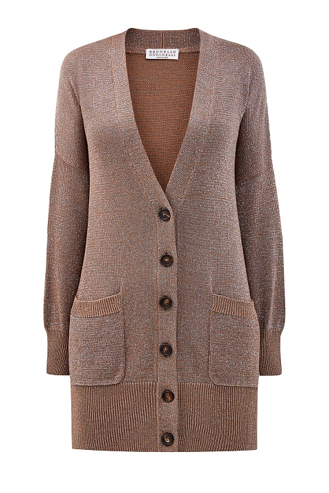 Удлиненный кардиган от Brunello Cucinelli создан из хлопковой пряжи. Прядение в одно сложение нити образует идеальную для летнего сезона легкую и мягкую фактуру ткани. Вплетенная нить серебристого люрекса создает игру света и тени, а шалевый ворот и застежка на крупные пуговицы подчеркивают расслабленный стиль изделия. Детали: накладные карманы, эластичная отделка нижнего края и манжет, спущенная линия плеч. Сделано в Италии.
