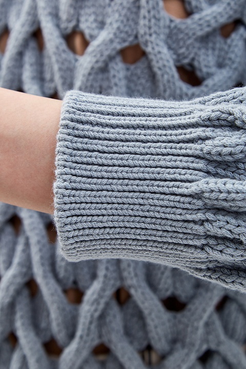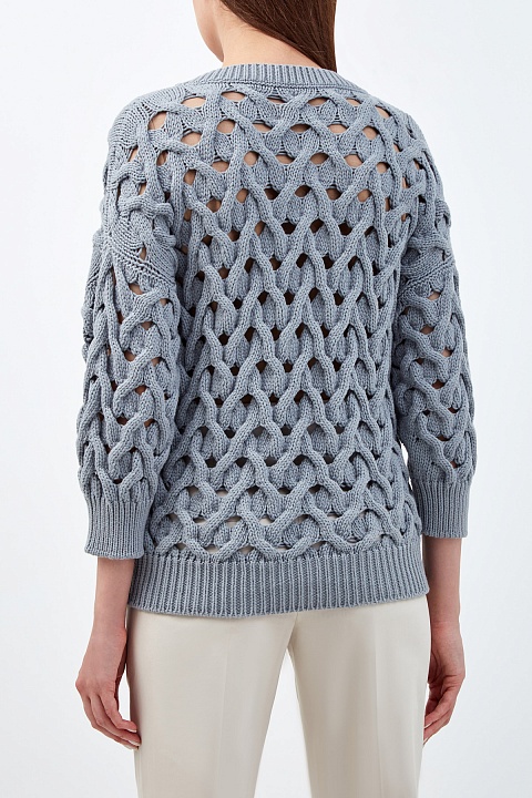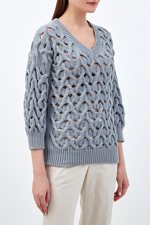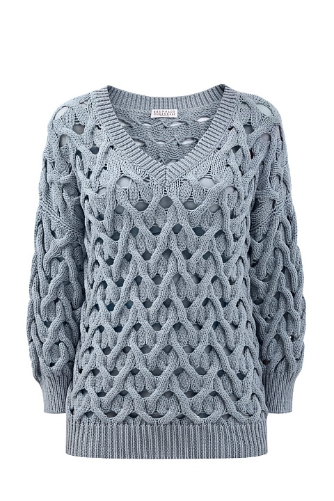 Джемпер ажурной вязки от Brunello Cucinelli идеально подходит для создания многослойных образов. Плотная хлопковая пряжа с нитью нейлона хорошо сохраняет форму и подчеркивает объемный крой изделия. Укороченные рукава на спущенной линии плеч придают расслабленное настроение. Детали: эластичная отделка кромок, V-образный вырез горловины. Сделано в Италии.