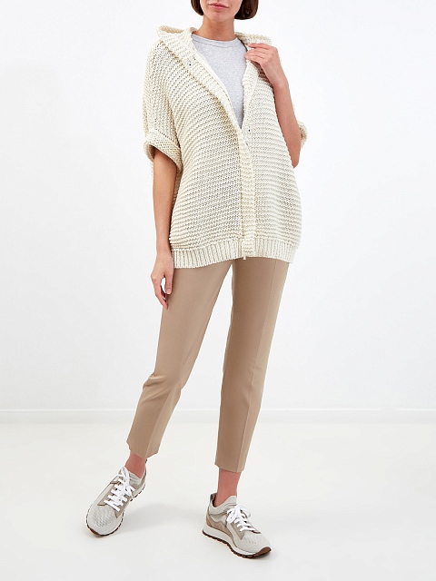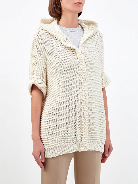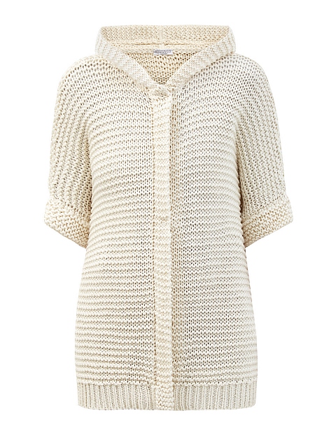 Элегантный женский кардиган с короткими рукавами от Brunello Cucinelli выполнен в теплом кремовом оттенке. Модель из фактурной пряжи ручной вязки на основе хлопка Soft Piuma идеально подходит для создания многослойных образов. Детали: капюшон и прорезные карманы, застежка на молнию с мерцающим пуллером Мониль на передней планке. Сделано в Италии.