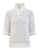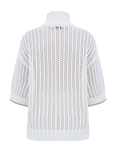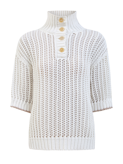 Джемпер из натуральных волокон хлопка от Brunello Cucinelli отличается утонченной отделкой Cable & Mesh. Сетчатое исполнение и традиционная техника вязки косами объединяются вместе для создания игры пустых и плотных участков с трехмерным эффектом. Модель отличается приспущенной линией плеч, рукавами ½, высоким воротом на пуговицах и контрастной окантовкой манжет. Сделано в Италии.