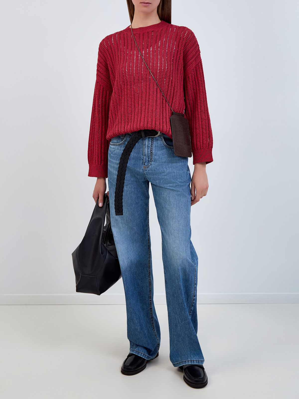 Джемпер из хлопковой пряжи от Brunello Cucinelli представлен в алом оттенке. Плотная текстура нитей и техника ажурной вязки с широкими петлями вносит в образ игру на контрастах, а особая структура плетения делает модель легкой и приятной в носке. Культовый элемент — цепочка мерцающих бусин Мониль на спинке ворота. Сделано в Италии.