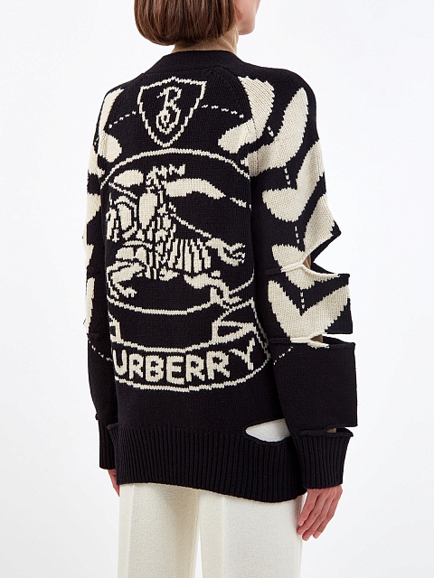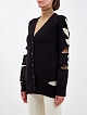 Эффектный женский кардиган от Burberry создан из эластичной шерсти мериноса с добавлением ценных волокон кашемира. Модель в элегантном черном цвете характеризуется декоративными разрезами, а также контрастной отделкой в технике интарсии на спинке изделия. Детали: V-образный вырез, застежка на пуговицы на передней планке, эластичные кромки в рубчик.