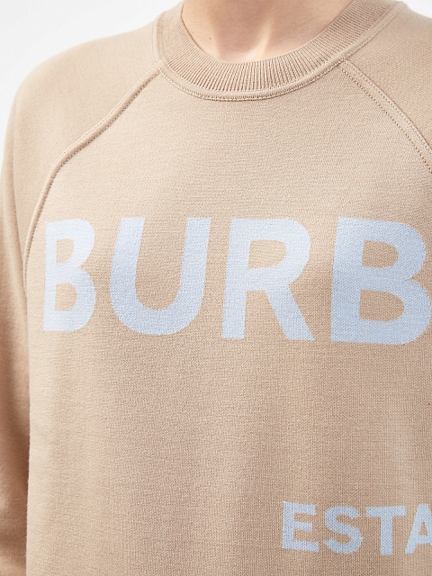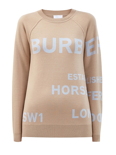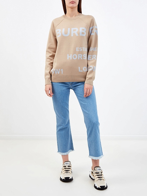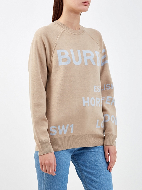 Объемный джемпер-свитшот от Burberry создан из тонкой шерсти в нейтральном бежевом оттенке. Выверенный состав с добавлением эластичных волокон позволяет материалу надолго сохранить первоначальную форму. Модель дополнена архивным принтом Horseferry в технике интарсии, силуэт в спортивном стиле сформирован за счет эластичной отделки манжет и нижнего края. Круглый вырез горловины завершает дизайн.