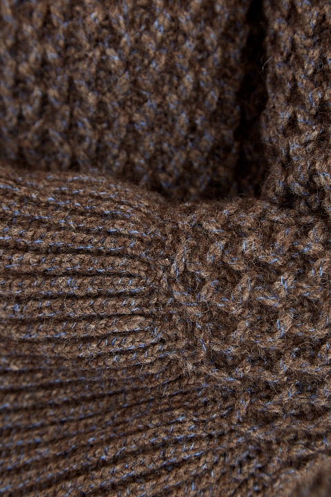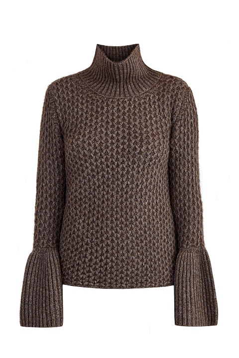 Мягкий свитер от Eleventy полностью выполнен из пряжи на основе шерсти яка в натуральном коричневом оттенке. Узорная вязка формирует сложный плетеный узор на поверхности, а вплетенная нить голубого цвета подчеркивает неоднородную фактуру материала. Эффектный образ создают объемные воланы на рукавах, а также ворот-стойка. Сделано в Италии.