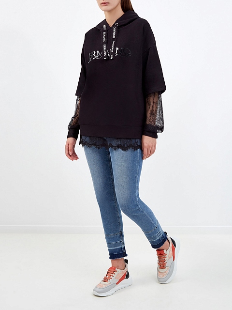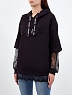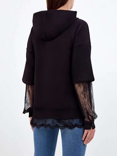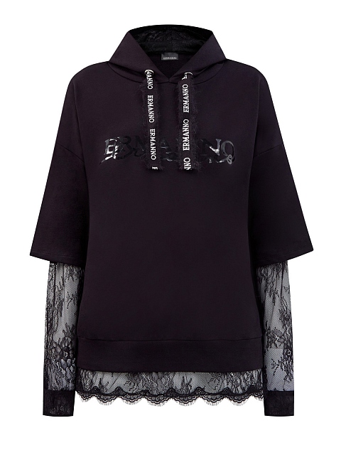 Худи от Ermanno Ermanno Scervino выполнено из плотного хлопка. Монохромный черный цвет усиливает контраст фактур — гладкий материал, присущий спортивному стилю, дополнен воздушным кружевом — ключевым элементом коллекций бренда. Расслабленное настроение подчеркивают объемный крой с капюшоном и кулиска с фирменным принтом. Сделано в Италии.