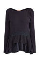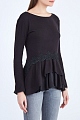 Изящный женский джемпер кроя по фигуре от Ermanno Scervino выполнен из фактурной и эластичной ткани из хлопка и шерсти. Модель в черном цвете дополнена двухслойной баской по линии талии со вставкой из атласной ткани и декором ажурным кружевом макраме. Детали: длинные рукава, круглая пройма горловины, кромки закрыты объемными швами. Сделано в Италии.