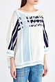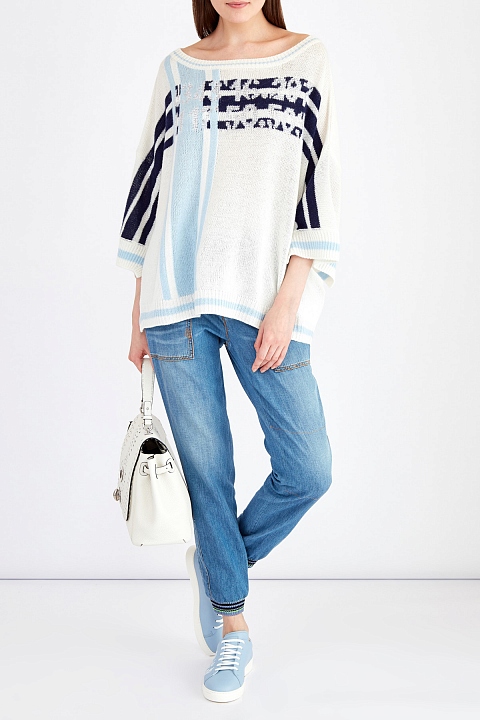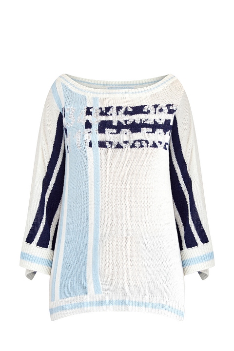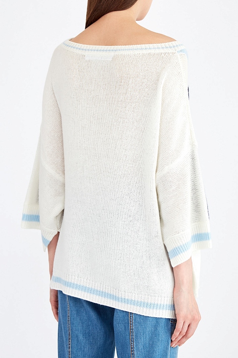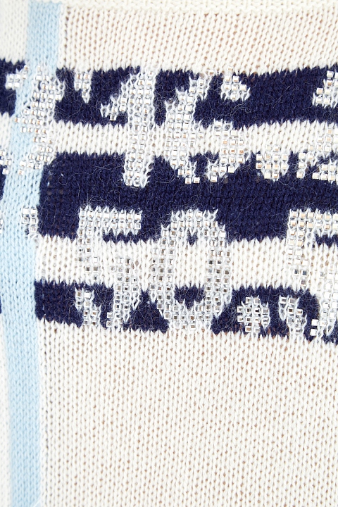 Мягкий женский джемпер комфортного oversize-кроя от Ermanno Scervino полностью выполнен из кашемировой пряжи молочного оттенка. Вязаный принт в виде координат флагманского бутика бренда дополнен отделкой мерцающими кристаллами и узором в виде полос в сапфирово-голубой гамме. Фирменный расслабленный стиль подчеркнут спущенной линией плеч, разрезами в боковых швах, а также овальной проймой горловины. Сделано в Италии.