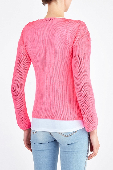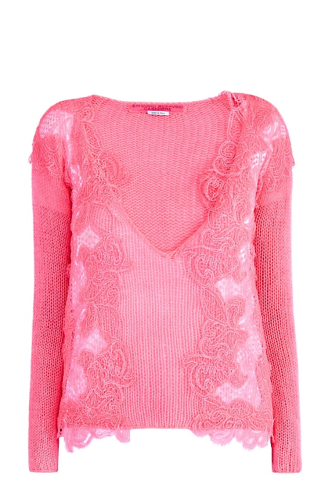 Элегантный женский джемпер от Ermanno Scervino полностью выполнен из кашемировой пряжи в технике крупной вязки. Модель насыщенного кораллово-розового оттенка инкрустирована фирменной деталью — цветочным кружевом ручной работы. Детали: глубокий V-образный вырез декольте, длинный рукав, спущенная линия плеч в расслабленном стиле. Сделано в Италии.
