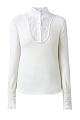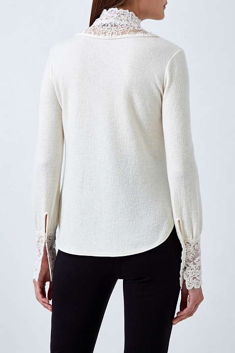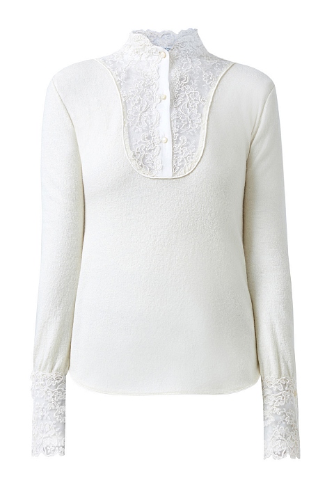 Изящный джемпер от Ermanno Scervino выполнен из мягкой ткани на основе шерсти и кашемира. Волокна шелка в составе придают поверхности благородный жемчужный отблеск. Расклешенные манжеты и кокетка на лифе выполнены из полупрозрачной вуали с вышитым вручную кружевным мотивом. Детали: ворот-стойка, закругленные нижние кромки, пуговицы из перламутра. Сделано в Италии.