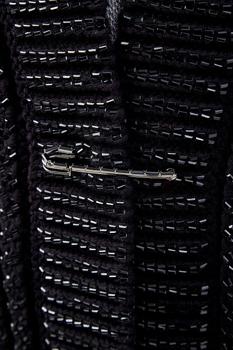 Базовый кардиган объемной вязки от Ermanno Scervino выполнен из шерстяной пряжи. Синтетические волокна в составе надолго сохраняют первоначальную форму изделия. Модель в черном цвете с мерцающей отделкой кристаллами в тон. Оригинальная застежка-брошь завершает дизайн. Детали: шалевый ворот, спущенная линия плеч, эластичные манжеты и нижний край, два кармана в боковых швах. Длина по спинке 81 см. Сделано в Италии.