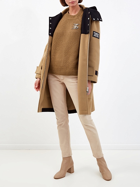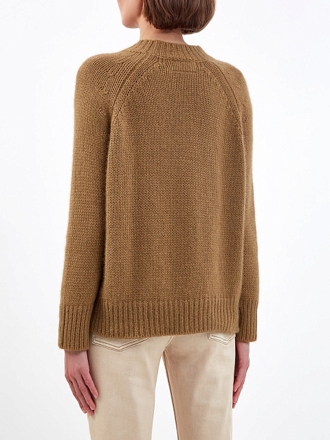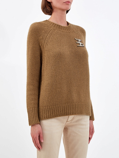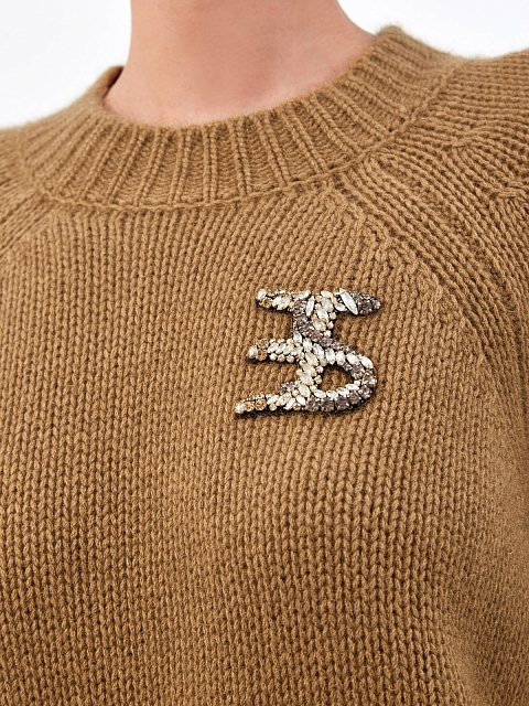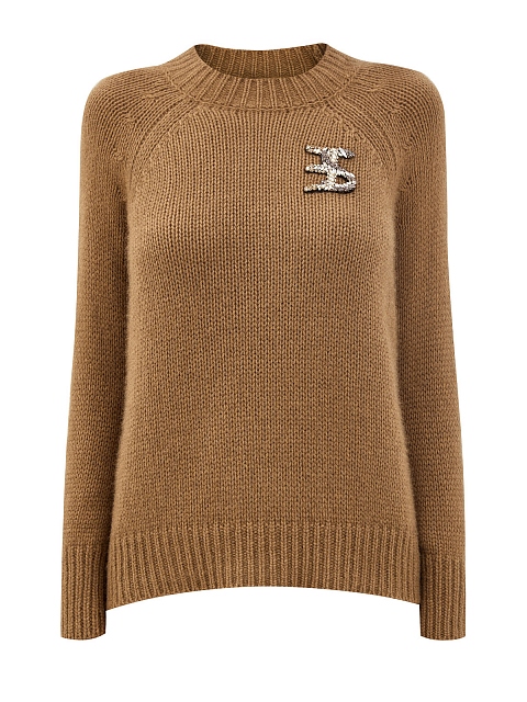 Элегантный женский джемпер от Ermanno Scervino выполнен из фактурной пряжи на основе шерсти опоссума и ценных волокон кашемира. Нить шелка в составе изделия придает материалу деликатный блеск, техника фактурной вязки обеспечивает посадку точно по фигуре. Модель в песочном оттенке дополнена инкрустированной кристаллами брошью в форме монограммы бренда. Детали: длинные рукава, круглый вырез горловины. Сделано в Италии.