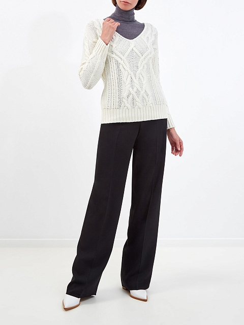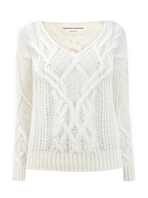 Элегантный джемпер от Ermanno Scervino выполнен из фактурной пряжи на основе шерсти, вискозы и шелка. Планки изделия декорированы объемным вязаным узором «косы». Особенностью модели стала выполненная вручную отделка кристаллами по всей поверхности, изящные линии подчеркивают V-образный вырез декольте. Детали: прямой силуэт, эластичные кромки в рубчик. Сделано в Италии.