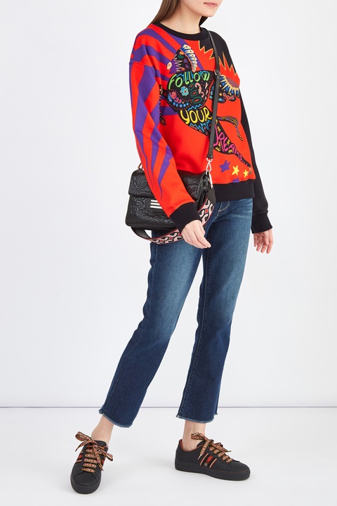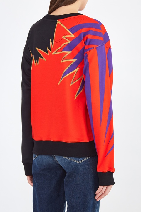 Яркий свитшот от Etro выполнен из плотного хлопка в контрастной черно-алой гамме. Передняя планки дополнены асимметричным абстрактным принтом, вдохновленным романом Иена Макьюена «The Daydreamer». Детали: манжеты и нижняя кромка с эластичной окантовкой в рубчик, спущенная линия плеч, круглая пройма горловины. Сделано в Италии.