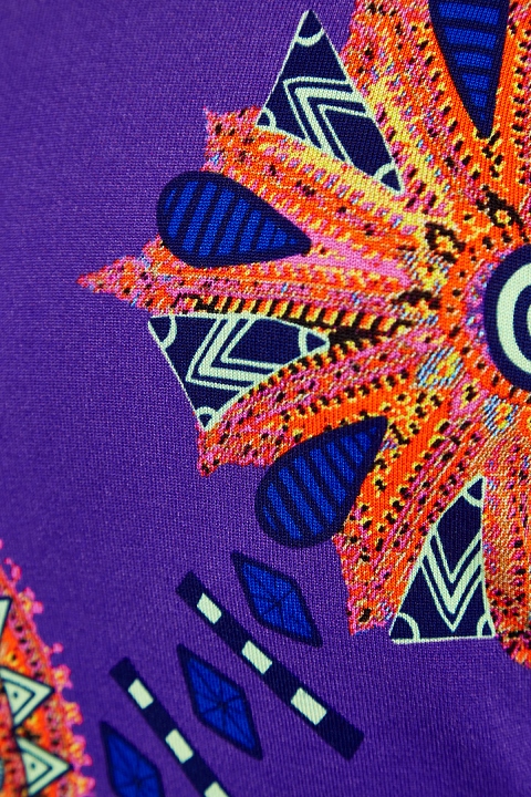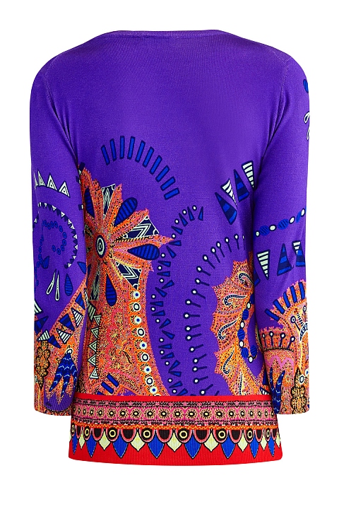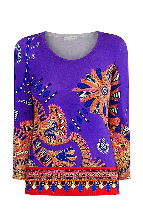 Яркий джемпер по фигуре от Etro выполнен из эластичной пряжи на основе волокон шелка. Эффектный образ в фирменном стиле создает этнический макро-принт, разработанный специально для каждого из элементов кроя и созданный в сиреневых и насыщенных охровых тонах. Детали: круглая пройма горловины, рукава ¾ с эластичными манжетами и нижняя кромка в рубчик. Сделано в Италии.