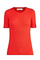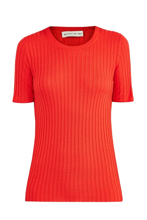 Минималистичный джемпер облегающего кроя от Etro выполнен из пряжи с добавлением волокон шелка, которые придают поверхности гладкость и благородный блеск. Изделие насыщенного алого оттенка создано в технике фактурной вязки в широкий рубчик. Детали: круглая пройма горловины, короткие рукава с объемной окантовкой кромок. Сделано в Италии.