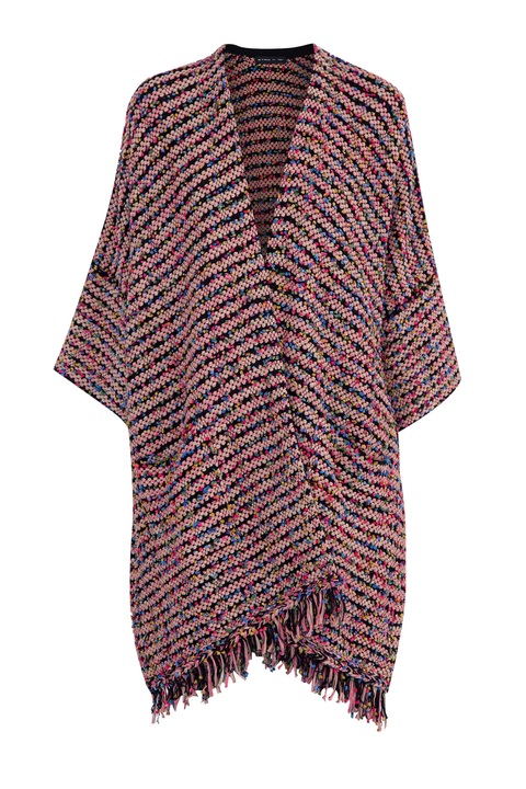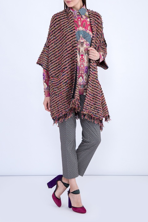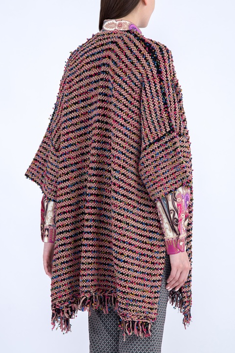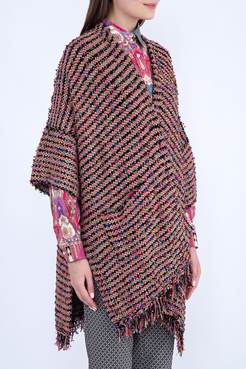 Накидка Etro расклешенного кроя характеризуется объемной вязкой из нитей модернизированной вискозы разных оттенков. Модель с укороченными рукавами-реглан и накладными карманами по бокам. Изделие без застежек, с разрезами по бокам и кромкой, украшенной пышной бахромой. Сделано в Италии.