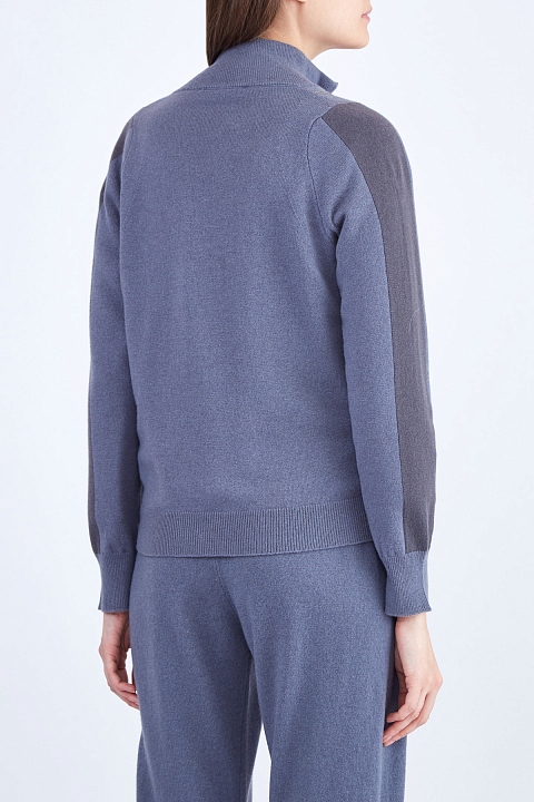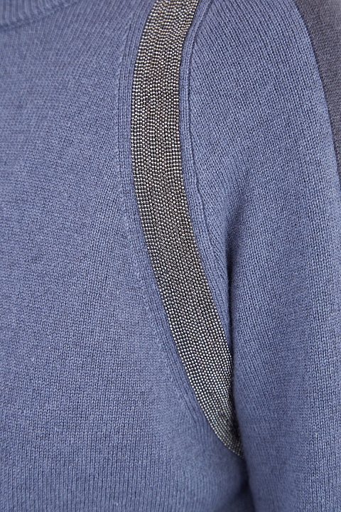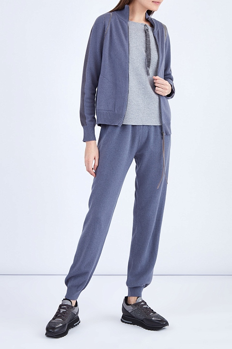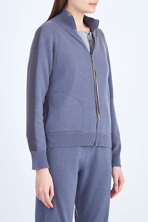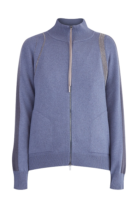 Женская толстовка от Fabiana Filippi выполнена из фирменной пряжи «Platinum» на основе мериносовой шерсти сине-голубого оттенка с волокнами шелка и кашемира для придания материалу дополнительной мягкости. Рукава-реглан дополнены инкрустацией цепочек бусин ювелирной огранки. Стиль спортшик подчеркнут лампасами на рукавах с эластичными кромками, застежкой на молнию и прорезными карманами. Сделано в Италии.