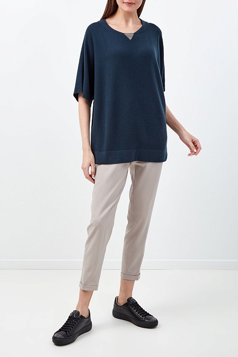 Базовый джемпер от Fabiana Filippi создан из натуральной кашемировой пряжи в густом изумрудном оттенке. Благородный материал обеспечивает тепло и комфорт. Свободный силуэт не стесняет движений, а геометрическая вышивка из мерцающих бусин вносит фирменный изящный штрих. Детали: струящийся крой, короткие рукава, бесшовная обработка нижнего края. Сделано в Италии.