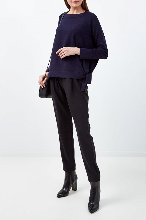Джемпер свободного кроя от Fabiana Filippi выполнен из тонкой шерстяной пряжи Platinum. Нить кашемира делает ткань действительно теплой. Модель создана в глубоком оттенке сапфира, расслабленный крой дополнен завязками сбоку и спущенной линией плеч. Детали: круглый вырез горловины, длинные рукава, уплотненные кромки с бесшовной обработкой. Сделано в Италии.