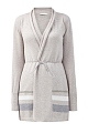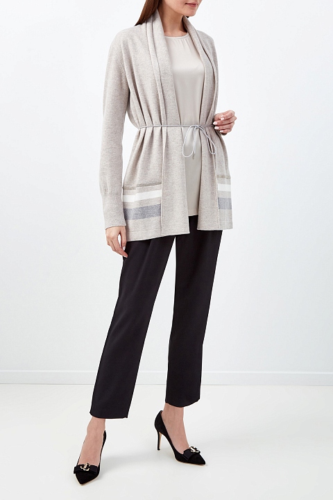 Мягкий кардиган от Fabiana Filippi создан в серо-бежевом оттенке из пряжи Platinum на основе шерсти мериноса, кашемира и шелка. Полностью натуральный состав делает модель особенно актуальной в холодный сезон. Свободный силуэт с шалевым воротом и поясом не стесняет движений, а отделка в виде полос идеально подходит для создания гармоничных образов. Детали: вышивка из мерцающих бусин, длина по спинке 73 см. Сделано в Италии.