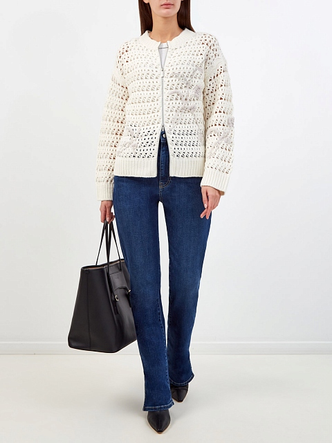 Стильный кардиган от Fabiana Filippi выполнен в кремовом оттенке из пряжи Platinum на основе шерсти мериноса, кашемира и шелка. Техника узорной вязки и вышивка макраме ручной работы с вплетенными ювелирными цепочками делают модель идеальной для создания женственных многослойных образов. Застежка на молнию с двойным пуллером завершает дизайн. Сделано в Италии.