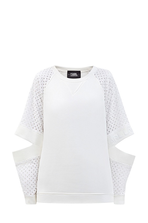 Свитшот от Karl Lagerfeld выполнен из плотного хлопкового футера. Объемный крой в спортивном стиле дополнен рукавами с английской кружевной вышивкой и разрезами. Минималистичный дизайн подчеркнут вышитым нитью в тон логотипом. Детали: круглый вырез горловины, декоративный шов на вороте, эластичная отделка по краям.