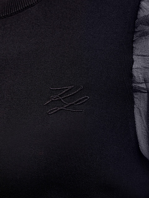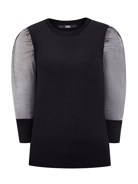 Эффектный женский джемпер в элегантном черном цвете от Karl Lagerfeld. Модель создана из мягкого трикотажа на основе экологически чистых волокон вискозы, эластичная отделка кромок в рубчик обеспечивает комфортную посадку. Неформальный штрих в образ вносят объемные рукава-фонарики из невесомой полупрозрачной органзы. Изящная вышивка с монограммой бренда на передней планке в тон изделия завершает дизайн.