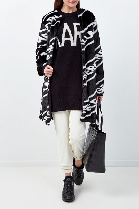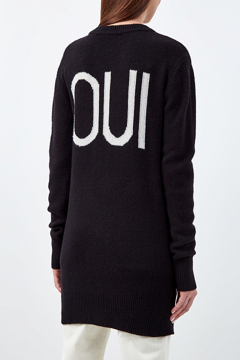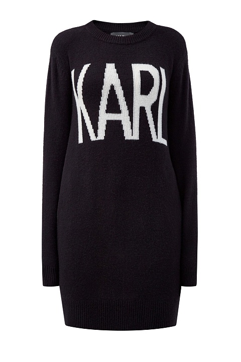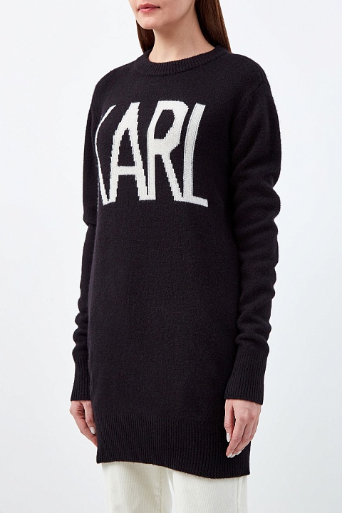 Минималистичный джемпер от Karl Lagerfeld выполнен из шерстяной пряжи. Синтетические волокна в составе надолго сохраняют цвет и форму изделия. Образ в стиле логомании созадает макро-логотип KARL OUI в технике интарсии. Универсальная длина 77 см позволяет носить изделие в качестве платья. Детали: прорезные карманы в боковых швах, эластичная отделка манжет и нижнего края.
