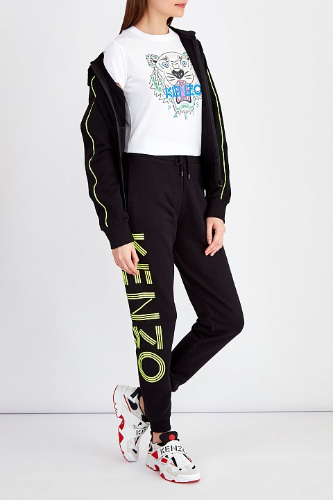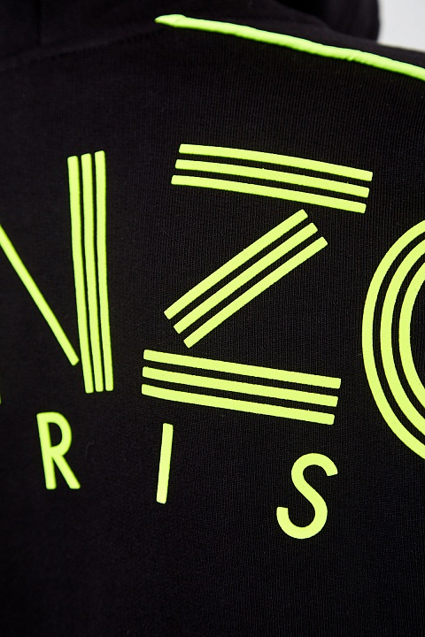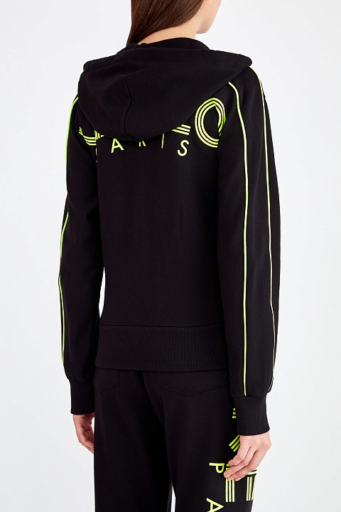 Яркая толстовка от Kenzo выполнена в базовом черном цвете из плотного хлопкового футера. Натуральный эластичный материал обеспечивает комфорт в движении, а фактурная внутренняя поверхность дополнительно утепляет изделие. Спущенная линия плеч и эластичная отделка кромок формируют силуэт в спортивном стиле. Детали: макро-монограмма и контрастная тесьма на рукавах и спинке выполнены в неоново-зеленом оттенке, прорезные карманы.