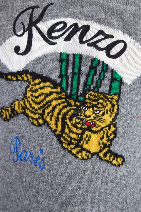 Стильный женский джемпер от Kenzo выполнен из теплой шерстяной пряжи жемчужно-серого оттенка. Передняя планка декорирована аппликацией в контрастных тонах «Bamboo Tiger» в технике интарсии. Модель на спущенной линией плеч дополнена элементами эластичной вязки в рубчик по нижней кромке, манжетам рукавов и круглой пройме горловины.