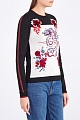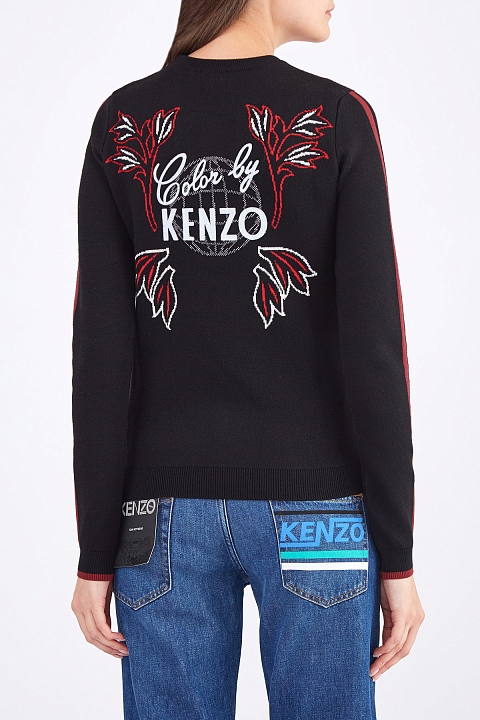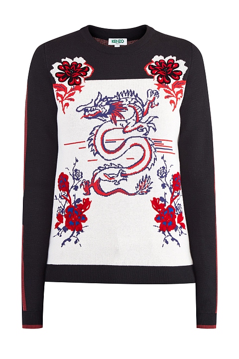 Яркий женский джемпер «Dragon» из коллекции осень-зима от Kenzo выполнен из теплой пряжи из шерсти и хлопка в черном цвете. Планки изделия декорированы жаккардовой вышивкой, вдохновленной традиционными японскими мотивами, а также аппликациями с фактурной бархатной поверхностью. Втачные рукава дополнены жаккардовыми лампасами темного алого оттенка, создавая образ в стиле спортшик. Круглая пройма горловины, а также нижняя кромка и манжеты рукавов, обрамленные каймой в тон декору, завершены эластичной резинкой английской вязки для комфортной посадки по фигуре.