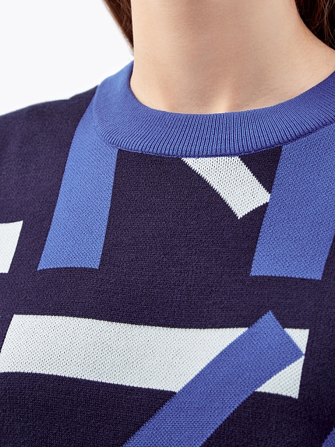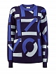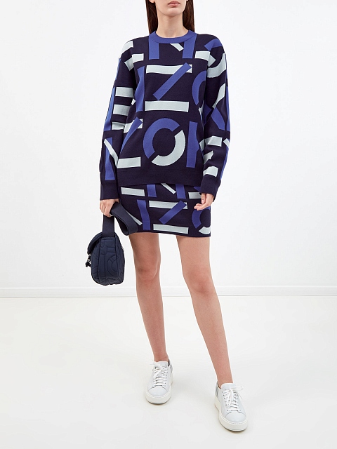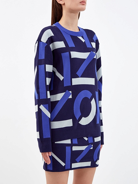 Стильный женский джемпер от Kenzo создан в синих, черных и белых тонах. Износостойкий материал на основе дышащего хлопка и эластана повторяет движения тела и не образует складок. Жаккардовый макро-принт с монограммой бренда придает образу неформальный акцент. Детали: длинные рукава, круглый вырез горловины, эластичная отделка кромок из трикотажа.