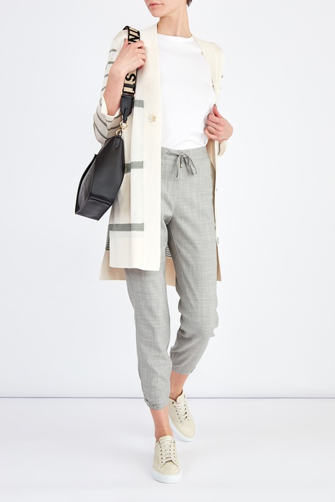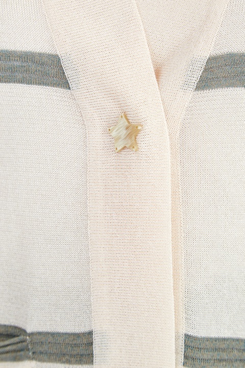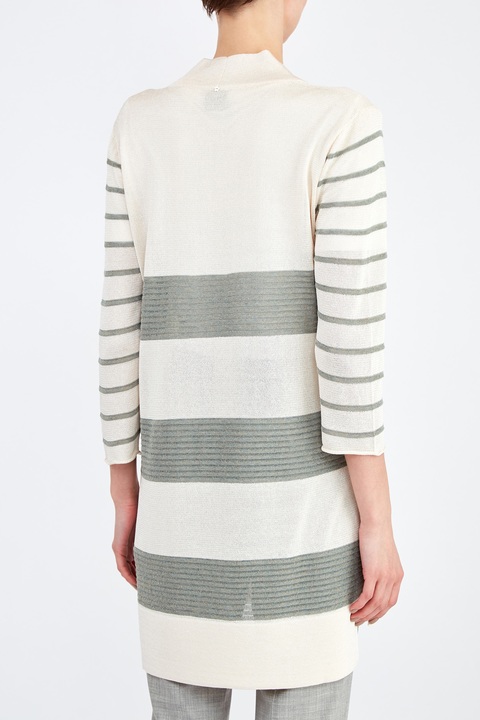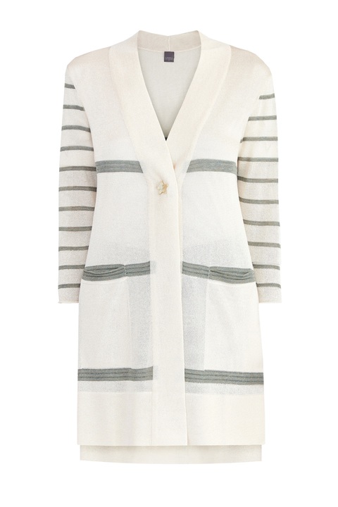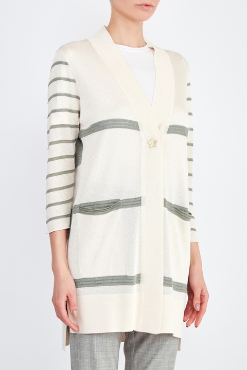 Лаконичный кардиган свободного кроя от Lorena Antoniazzi создан из тонкой пряжи с гладкой фактурой и легким сатиновым блеском в кремовом оттенке. Модель декорирована вязаным принтом в широкую полоску фисташкового цвета на планках и в тонкую полоску на рукавах. Накладные карманы подчеркивают присущий бренду расслабленный стиль. Детали: разрезы в боковых швах, асимметричные нижние кромки. Сделано в Италии.