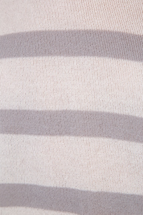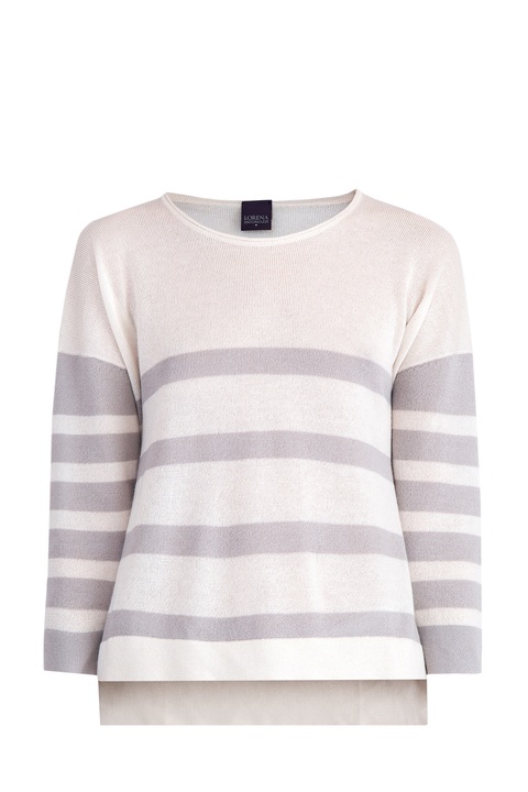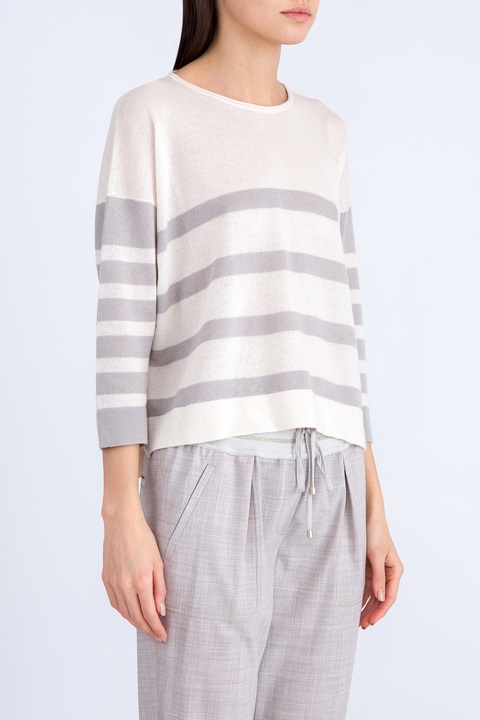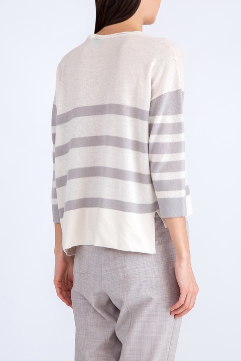 Лаконичный женский джемпер Lorena Antoniazzi свободного кроя, выполненный чулочной вязкой из нежного кашемира с добавлением волокон хлопка бежевого цвета с узором в полоску. Расслабленный образ модели подчеркивают укороченные рукава со спущенными линиями плеч, широкий ворот и асимметричная нижняя кромка с удлинением на спинке. Сделано в Италии.