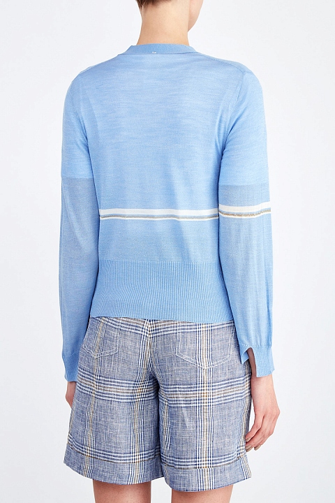 Минималистичный кардиган объемного кроя от Lorena Antoniazzi полностью выполнен из тонкой пряжи на основе волокон шерсти и шелка с легким сатиновым блеском. Модель с шалевым воротом оснащена застежкой на крупные пуговицы. Эластичные кромки формируют объемный силуэт и придают образу нотку расслабленного стиля. Детали: перфорированная символика на передней планке, вязаный узор в полоску на спинке и рукавах, разрезы на манжетах. Сделано в Италии.
