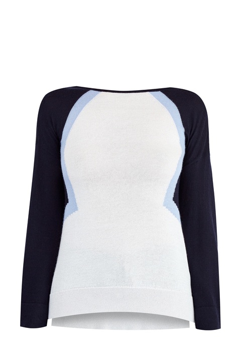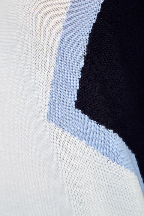 Джемпер из хлопка и кашемира в стиле colorblock от Lorena Antoniazzi выполнен в сапфировых, голубых и молочно-белых тонах из тонкой и мягкой пряжи в технике плотной чулочной вязки.. Расслабленный стиль, ставший визитной карточкой бренда, выражен через свободный силуэт со спущенной линией плеча и асимметричными нижними кромками с разрезами в боковых швах. Сделано в Италии.