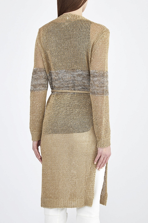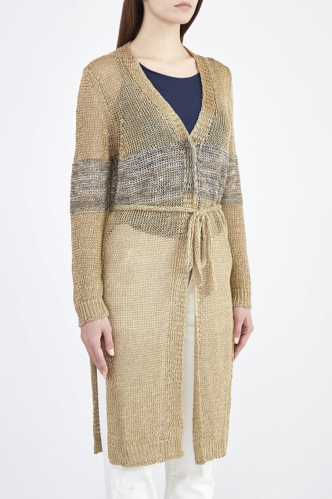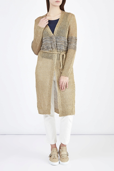 Длинный кардиган от Lorena Antoniazzi создан в технике крупной вязки из льняной пряжи карамельного оттенка с вплетенными гладкими нитями и пайетками, которые придают поверхности благородное сияние. Изделие в расслабленном стиле дополнено высокими разрезами по боковым швам, а также шалевым воротом и застежкой на потайные кнопки. Съемный вязаный пояс завершает дизайн. Сделано в Италии.