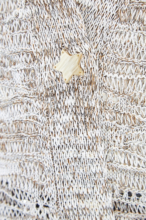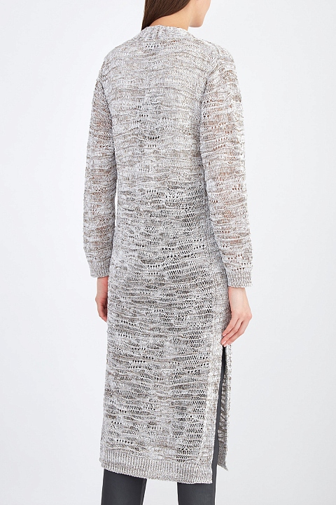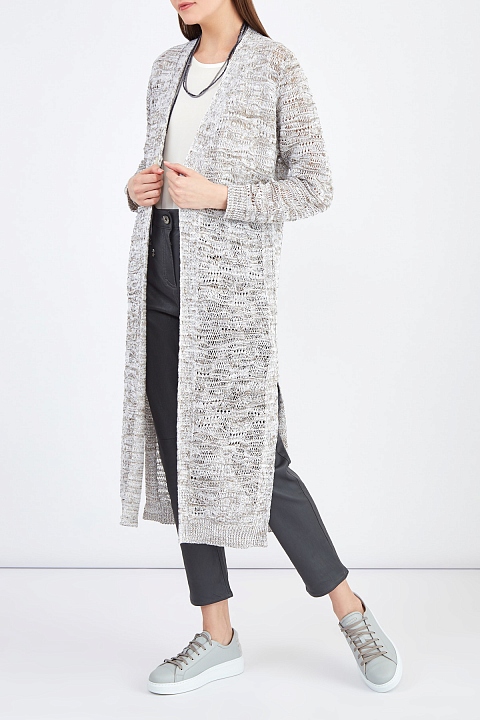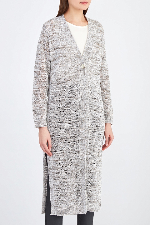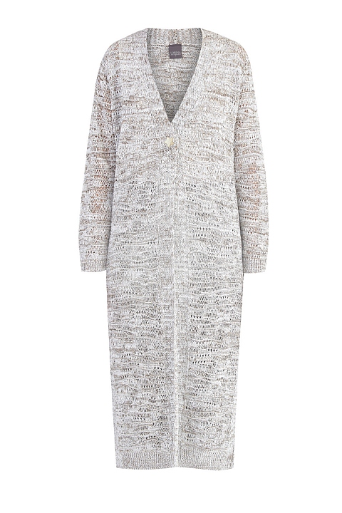 Удлиненный льняной кардиган ажурной вязки с разрезами по бокам
