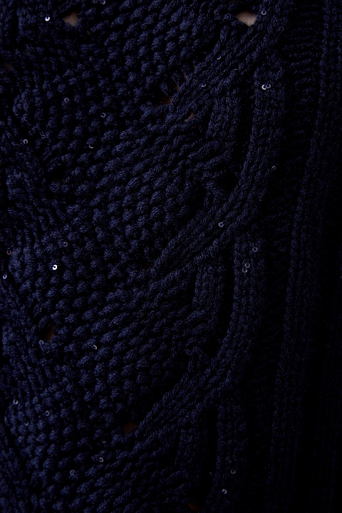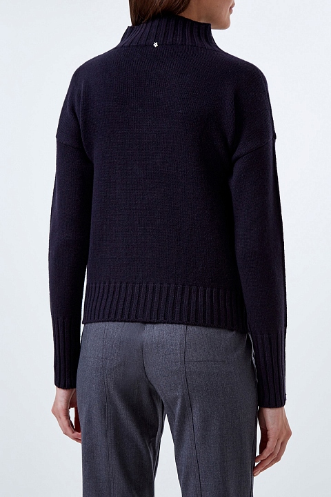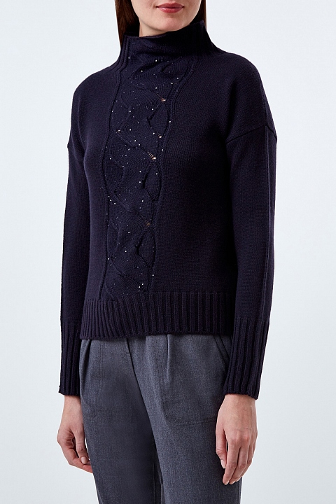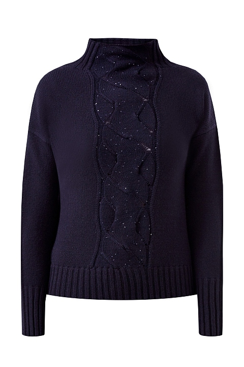 Свитер от Lorena Antoniazzi выполнен из невесомой пряжи на основе нитей шерсти, шелка и кашемира. Модель оттенка ночного неба с высоким цельнокроеным воротом дополнена традиционным узором «коса» с вплетенными пайетками. Свободный силуэт со спущенной линией плеч обеспечивает максимальный комфорт. Детали: манжеты и нижняя кромка в рубчик, фактурные швы вдоль рукавов. Сделано в Италии.