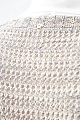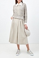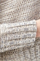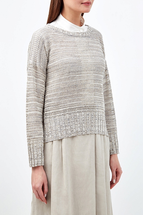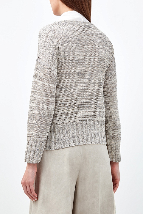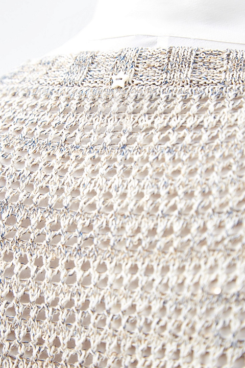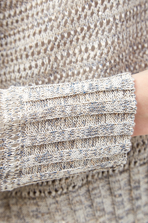 Минималистичный джемпер от Lorena Antoniazzi выполнен из хлопковой пряжи в технике ажурной вязки. Интересный графический акцент создает переплетение нитей бежевых и синих оттенков. Объемный oversize-силуэт со спущенной линией плеч и присборенным нижним краем создает образ в расслабленном стиле. Символика бренда на спинке из перламутра завершает дизайн. Сделано в Италии.