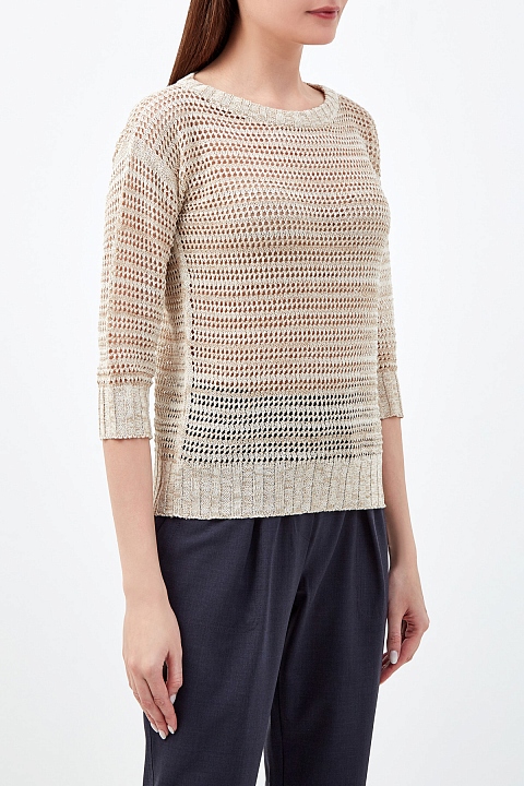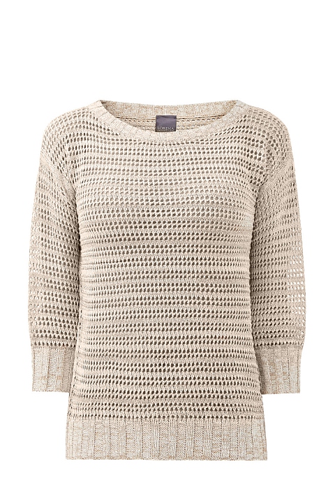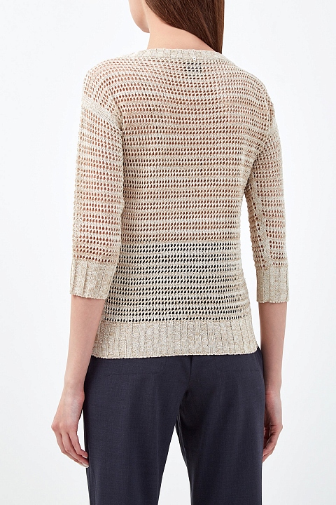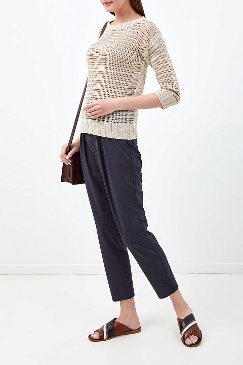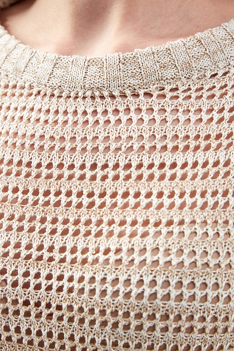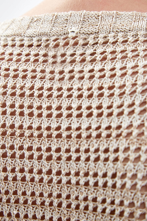 Минималистичный джемпер от Lorena Antoniazzi выполнен из хлопковой пряжи в технике ажурной вязки. Благодаря своему составу ткань обеспечивает максимальный комфорт в летний сезон. Объемный силуэт со спущенной линией плеч и присборенным нижним краем создает образ в расслабленном стиле. Символика бренда на спинке из перламутра завершает дизайн. Сделано в Италии.