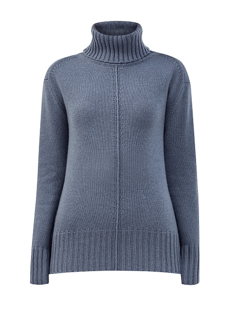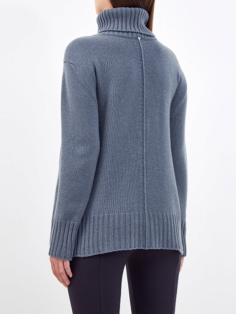 Мягкий женский свитер от Lorena Antoniazzi полностью выполнен из теплой кашемировой пряжи в васильковом оттенке. Вязка в чулочной технике и отделка кромок в рубчик подчеркивают фактуру натурального материала. Декоративные внешние швы вносят в образ неформальный штрих, свободный силуэт и спущенная линия плеч придают расслабленное настроение. Детали: высокий ворот, фирменная символика на спинке. Сделано в Италии.